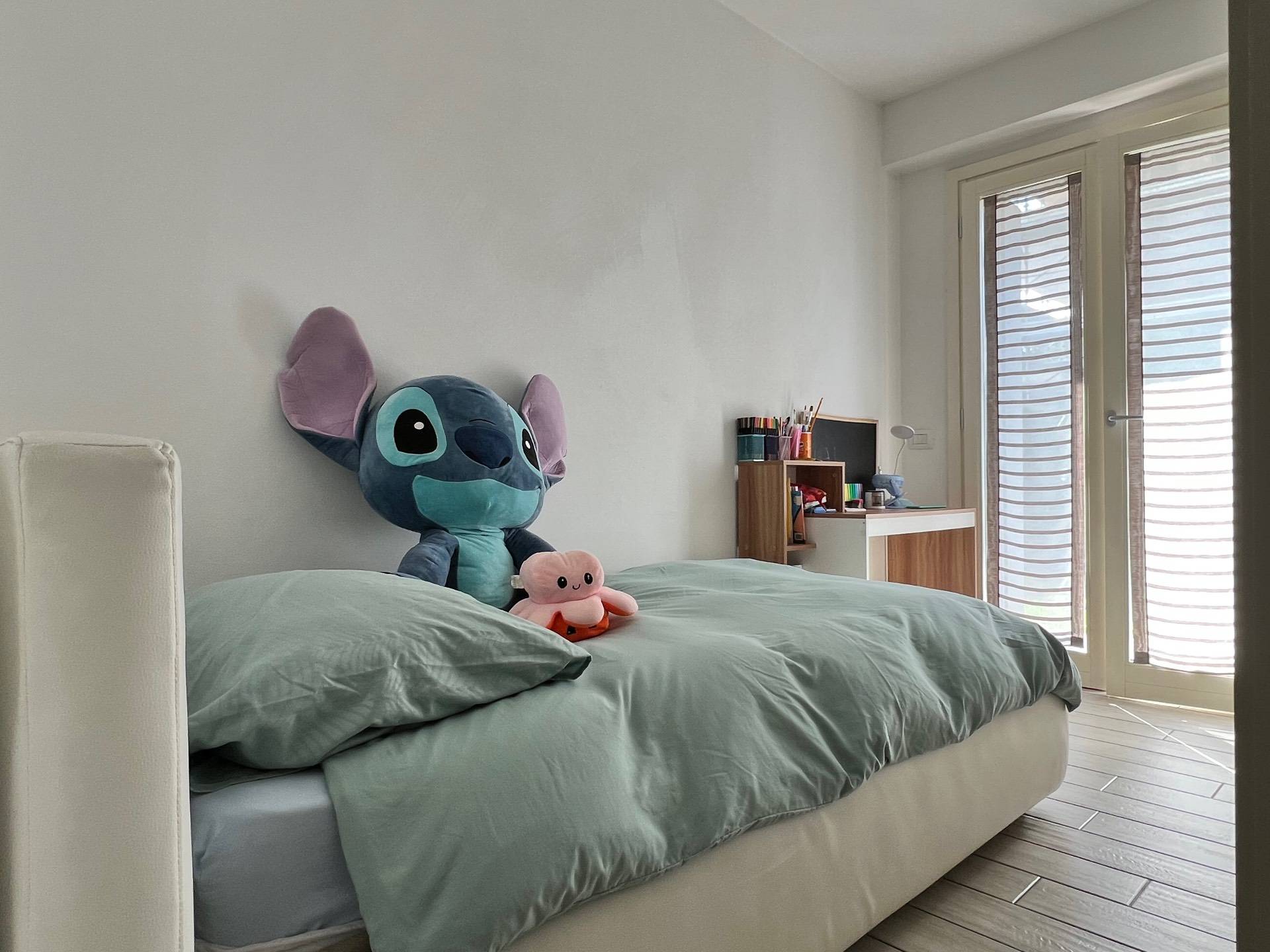 L’appartamento è sito all’interno di un condominio la cui edificazione è stata completata nel 2014. e si compone di ingresso su zona giorno salotto/pranzo con cucinotto, camera matrimoniale, due studi perfetti come camerette, due bagni completi di doccia ed un comodo ripostiglio.