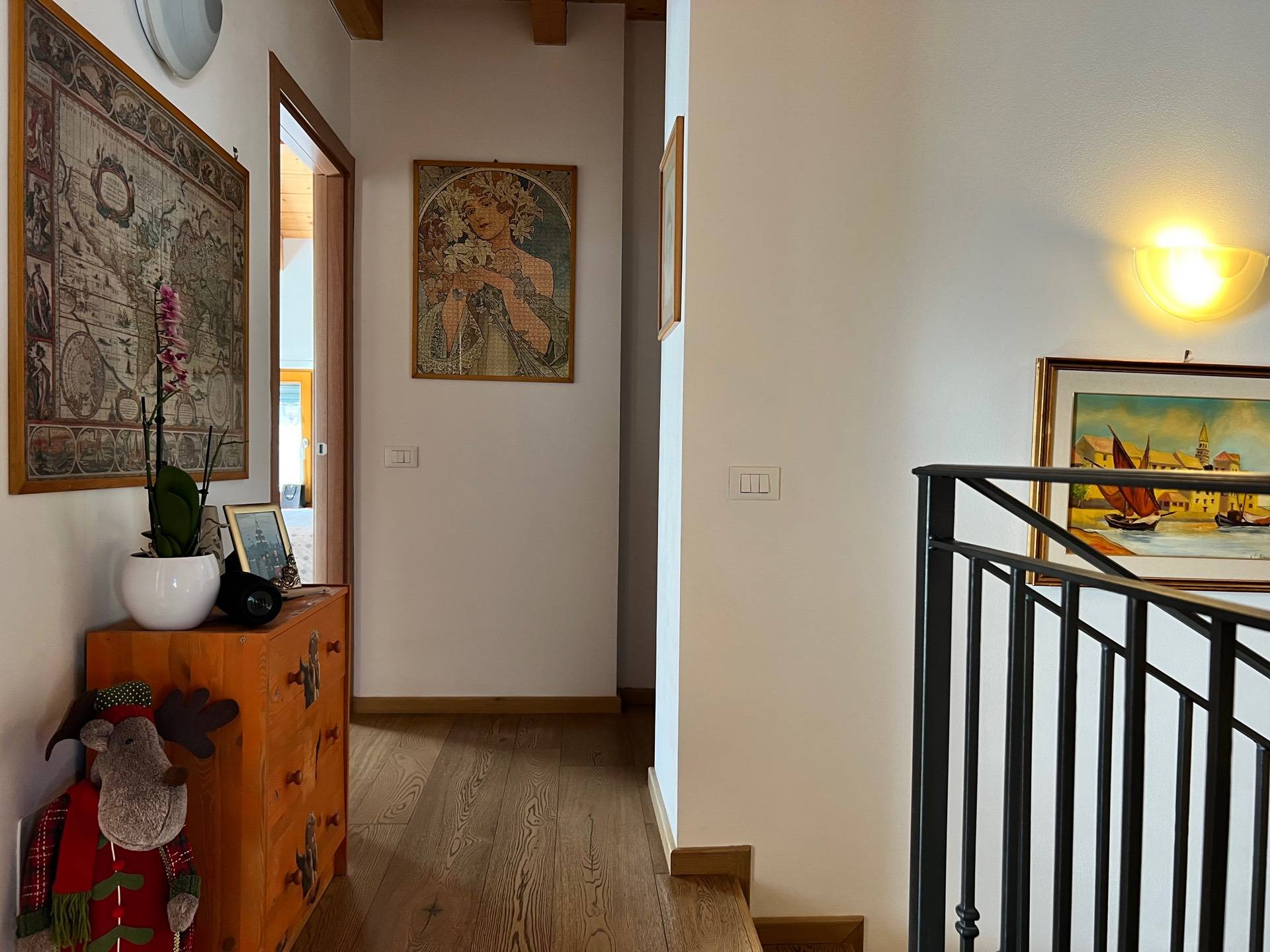 Salendo la scala accediamo alla zona notte con travi a vista e pavimentazione in legno di qualità: spaziosa camera matrimoniale con armadiatura su misura e porta finestra per accedere alla terrazza, seconda camera con scrivania, stireria utilizzata come terza camera sempre con accesso al terrazzo e secondo bagno completo.