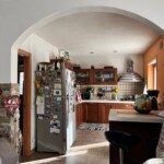 All’ingresso del pian terreno abbiamo un openspace con l’ampio soggiorno con stubotto, che rende ancora più piacevole questo spazio, tavolo da pranzo e cucina a vista con penisola centrale e sgabelli. Infine uscendo dalla porta finestra si accedere allo spazio esterno piastrellato. Sempre in questo piano troviamo un bagno completo con doccia.