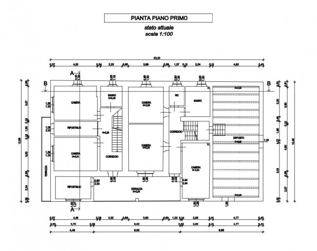 PIANO PRIMO con corridoio, 3 stanze, due bagni e grande terrazza comune con la porzione adiacente.